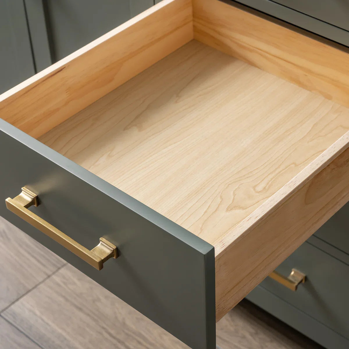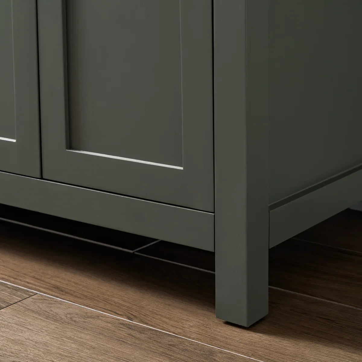 This freestanding double vanity set features a clean-lined silhouette and plenty of sleek, modern flair for larger-sized bathrooms. It has a solid wood base, and it comes in a muted tone that complements a variety of styles and color palettes. Three functional center drawers and two cabinets each with a set of double doors provide ample space for towels, toiletries, and more. A Carrara white stone countertop and backsplash stretch 72" across, and it includes two rectangular ceramic under-mount sinks (faucets sold separately). No assembly is required, and there's an opening in the back for hassle-free installation.