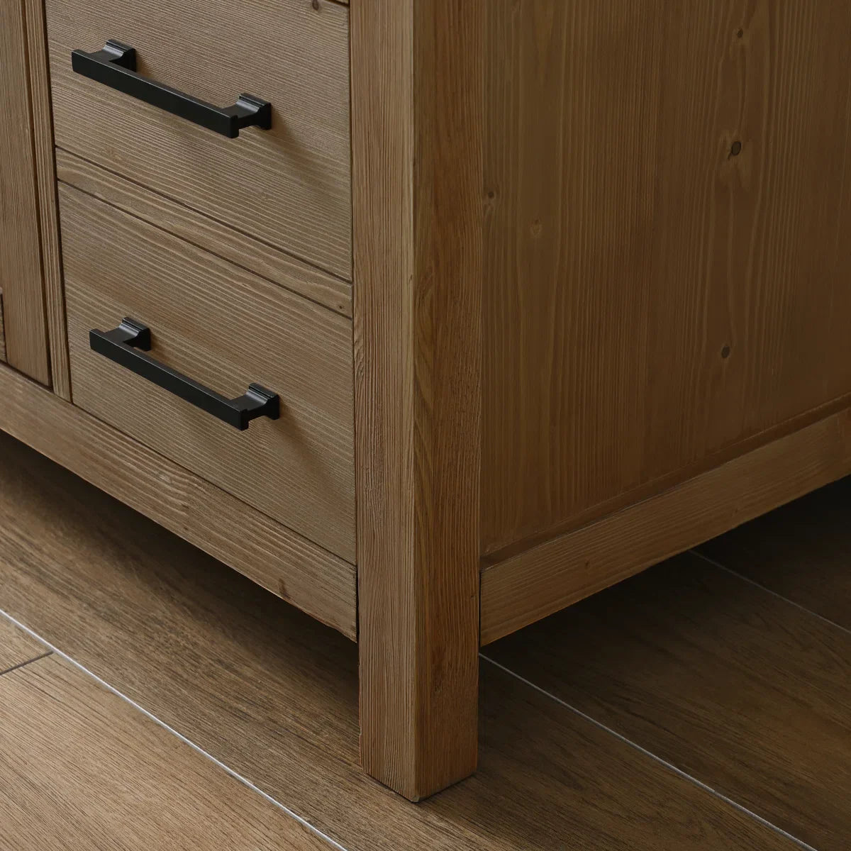 This freestanding single vanity set is your bathroom's new best friend, offering both style and storage in one sleek package. Crafted from solid and engineered wood with a rustic finish, the base features clean lines and distinctive metal hardware that contrasts with the wood. Two functional side drawers and a cabinet with double doors provide lots of space for daily essentials and other accessories. The 42" wide countertop and matching backsplash round out the design and help keep your walls pristine. A rectangular, ceramic undermount sink is included – faucet sold separately.